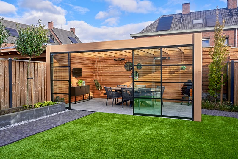 Met glaswanden zit u altijd goed. In het voorjaar geniet u van de eerste zon, zonder dat u last heeft van de wind. In de zomer schuift u de wanden open en haalt u het buitengevoel naar binnen. In de herfst en winter blijft u warm en droog, terwijl u toch uitkijkt over uw tuin. U hoeft niet meer naar binnen te vluchten als het weer omslaat.